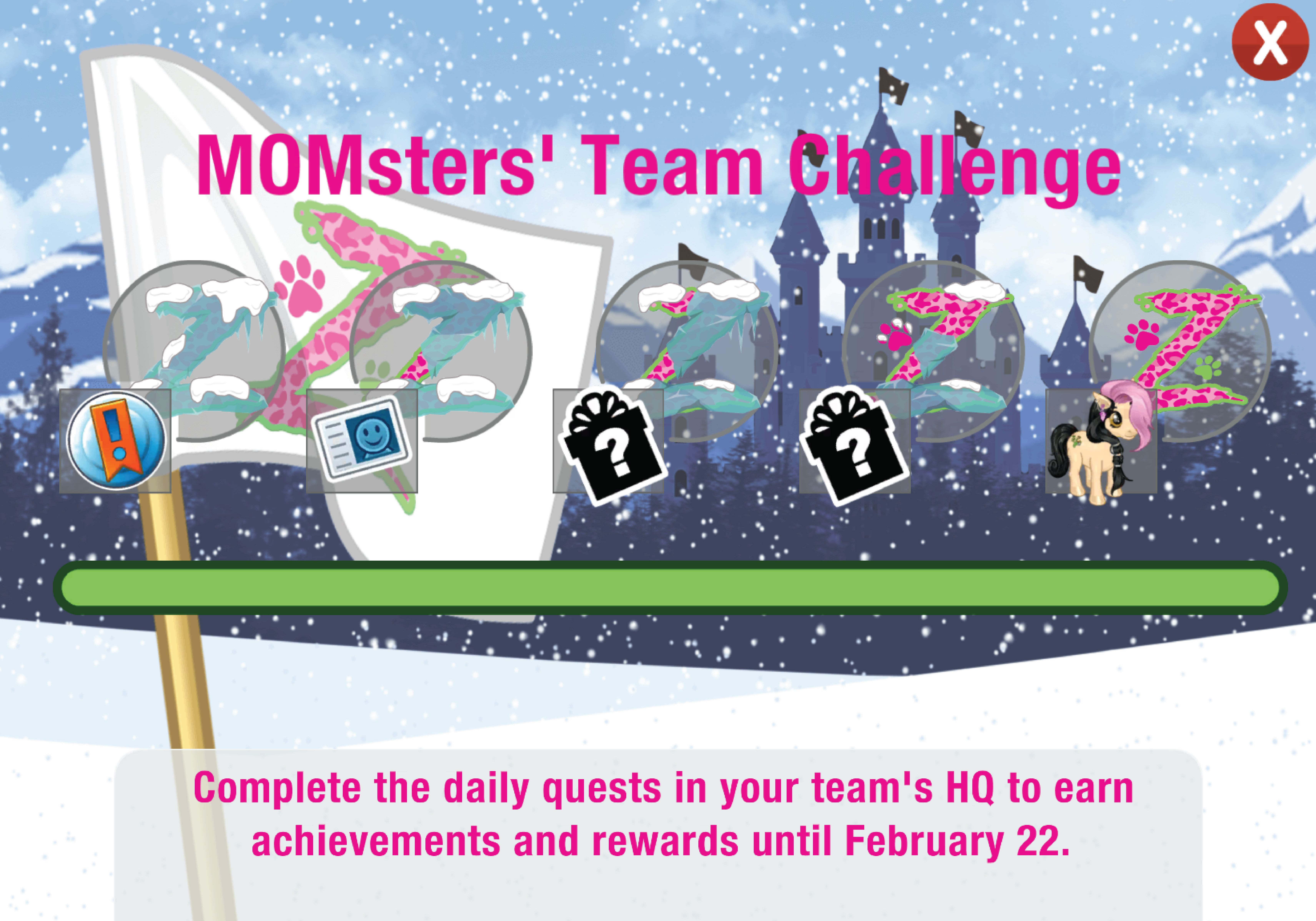 ¡La victoria depende totalmente del Desafío de Equipo! El 22 de febrero, el equipo con el mayor número de jugadores activos que hayan completado su Desafío de Equipo entre todas las comunidades será coronado ganador de la BatallaZ de Nieve y recibirá una recompensa especial.