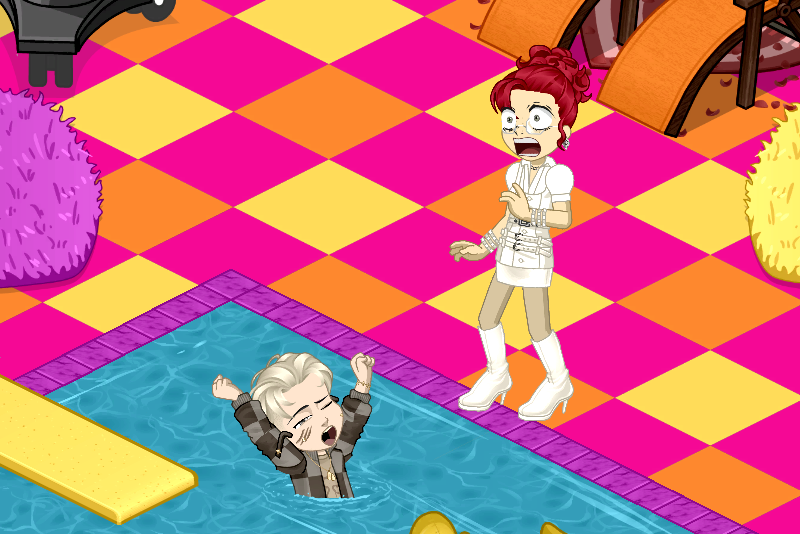 Alors là, vous allez pas en croire vos yeux: Sophistiquée, OUI, la Sophistiquée de la maison est tombée dans l'eau. rien de bien grave vous me direz, MAIS NON, plot twist, cette diva ne sait PAS nager... et encore PIRE, ses extensions et son bbl l'entraîne au fond du bassin... la rumeur dit que cette diva a été sauvée in extremis par Hylia, diva de la maison.