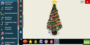 - Choisissez vos décos : En appuyant sur "+", vous ouvrez votre panneau latéral de décorations. Cliquez sur n'importe quel article pour le prévisualiser sur votre sapin. Vous pouvez ajouter jusqu'à 16 décorations par sapin.
