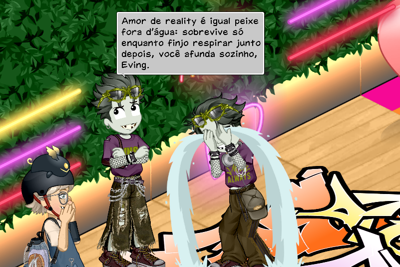Acabei de flagrar João e Eving ao vivo na Unitz Skylounge e a cena é de cinema. Depois de perderem no jogo Double Tap, aparentemente por causa do Eving, João na raiva soltou: 'Amor de reality é igual peixe fora d'água: sobrevive só enquanto finjo respirar junto... depois, você afunda sozinho, Eving'. Na foto, Eving aparece visivelmente abalado chorando e convenhamos, ele não merecia isso.